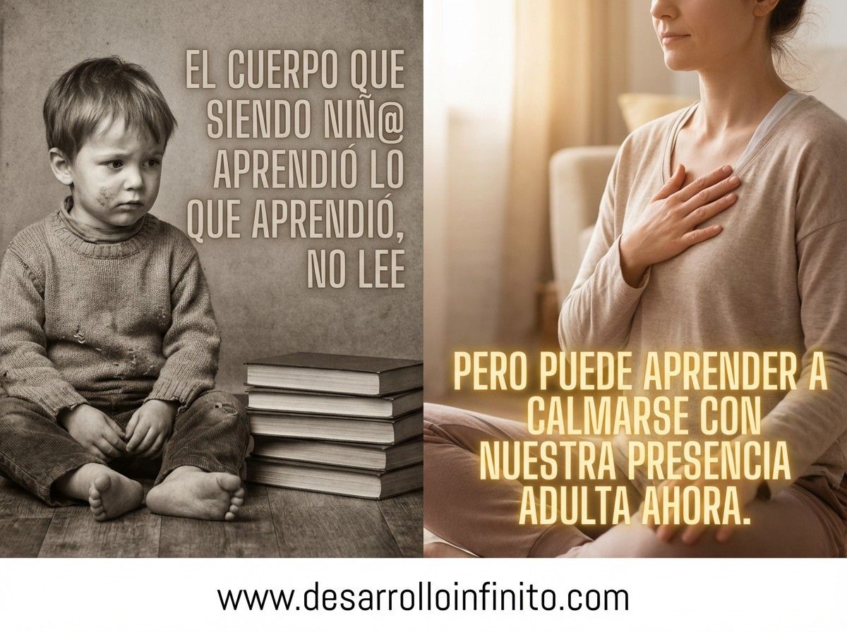 Necesitamos llegar al lugar donde los libros no pueden llegar. El cuerpo que siendo niñ@ aprendió lo que aprendió, no lee. Pero puede aprender a calmarse con nuestro Presencia Adulta Ahora.
