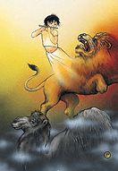 El león conquista libertad, pero sigue su búsqueda y asi es que se transforma en niño.